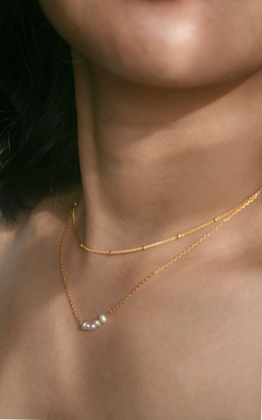 A delicate duo of gold chains paired with five elegant freshwater pearls. Simple, timeless, and perfect for everyday wear or layering up.