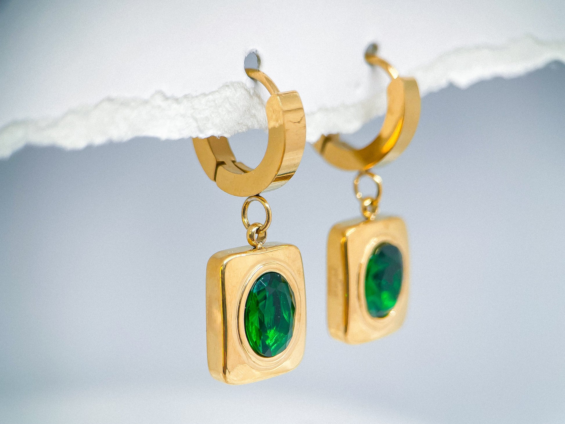 A dash of geometric charm, these gold hoop earrings are enhanced by stunning emerald green crystals set in a square frame. Ideal for adding a pop of color and modern elegance to your style.